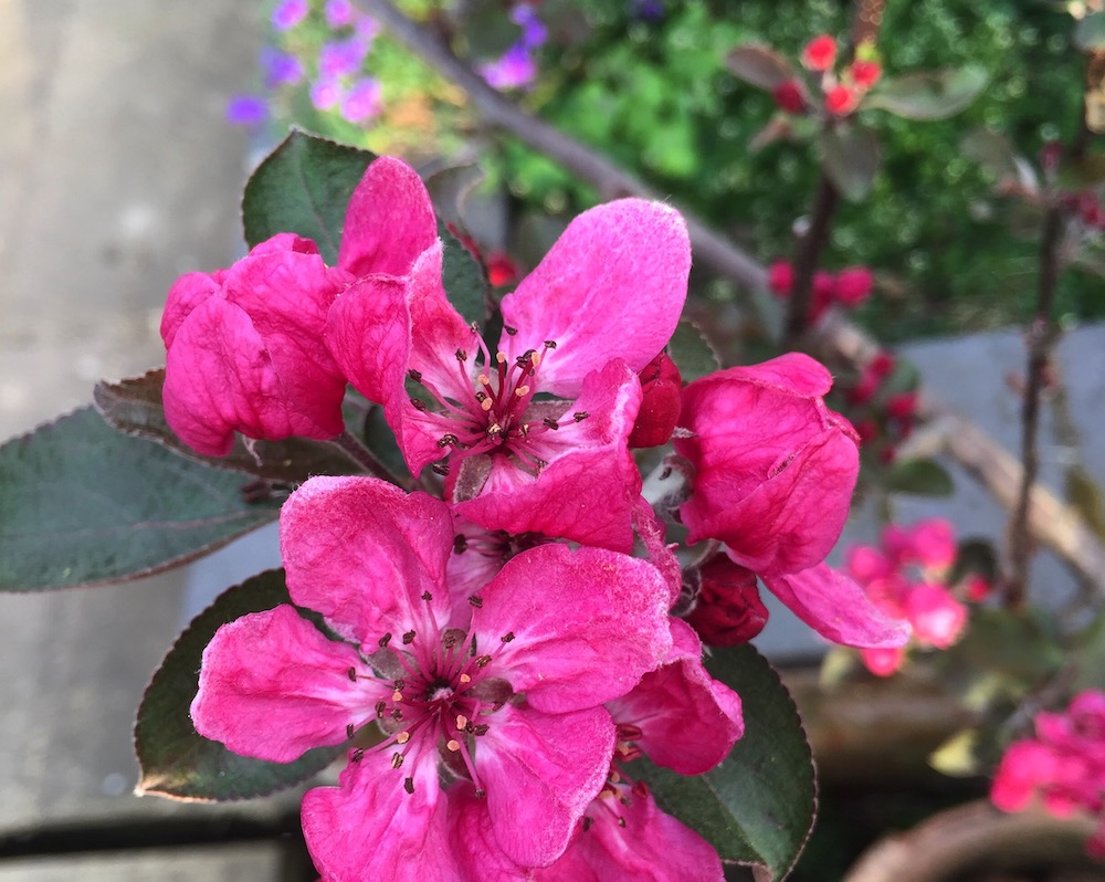 About four-five years ago I planted a small tree in the garden. I can’t remember who recommended a ‘Harry Baker’ crab apple tree but it was because of its extra value in giving a double whammy of fuchsia pink blossoms in spring and cherry-like crab apples in autumn. Harry Baker was a head gardener at RHS Wisley or somewhere. Today it fully popped into full colour and really cheered up the garden.