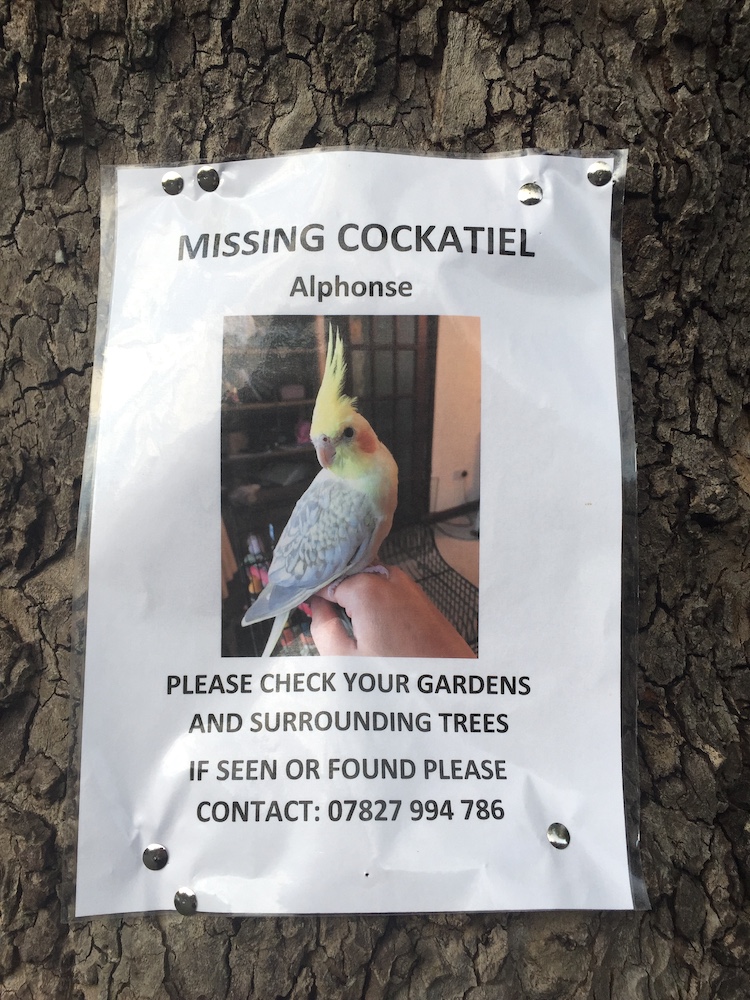 PS. Sheena’s parakeet photo reminded me that a cockatiel called Alphonse has gone missing around the Umberslade Rd area in Stirchley, near Muntz Park. Keep an eye out, although how do you catch a bird? Details…