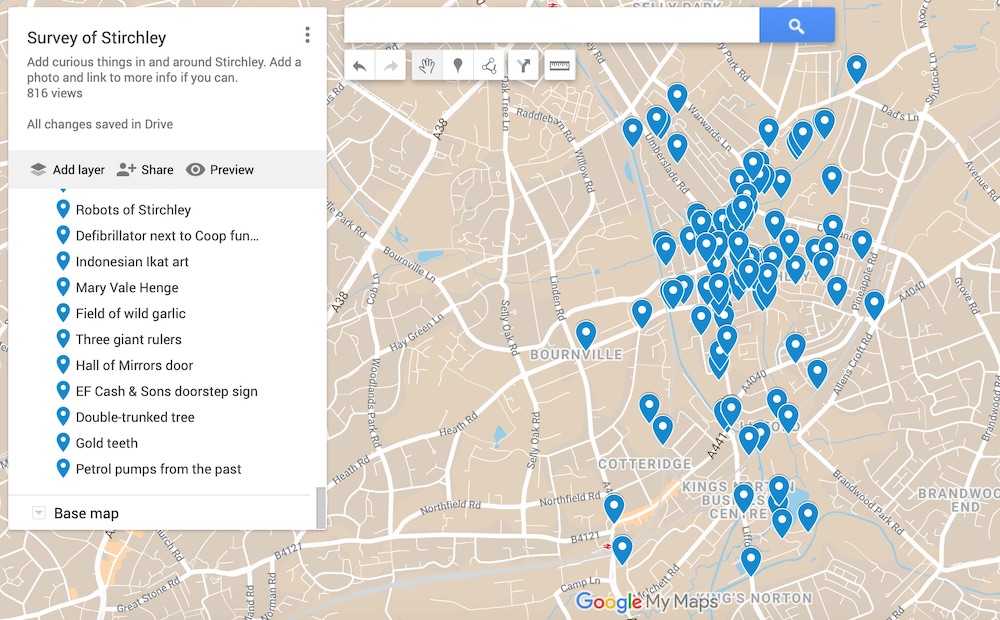 Restricted to solo walking our suburb of Stirchley we started noticing… everything. And then we started mapping all these things, inviting others to help, and creating a local taxonomy of the weird and usually ignored.