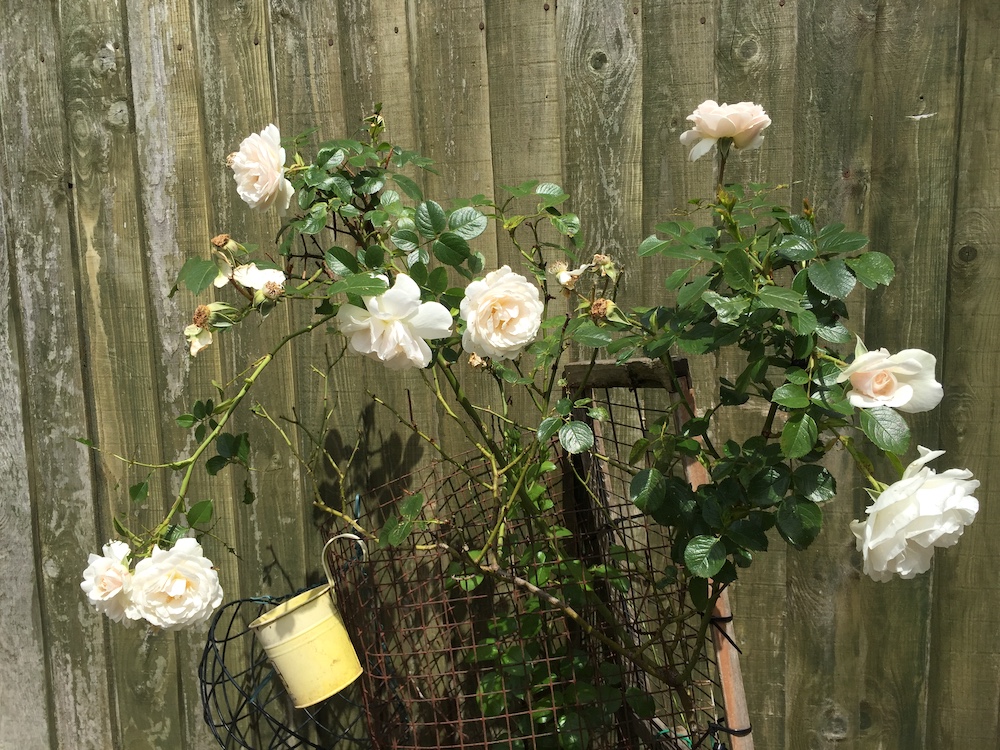Today I am thankful for the simple things, such as, sun-warmed bricks for my coffee-drinking, biscuit-dunking arse; a dousing of rain to water all the flowers and allotment crops and save me a job; and a garden full of roses and scents – I’ll leave you with our wedding rose (anniversary due in two weeks).